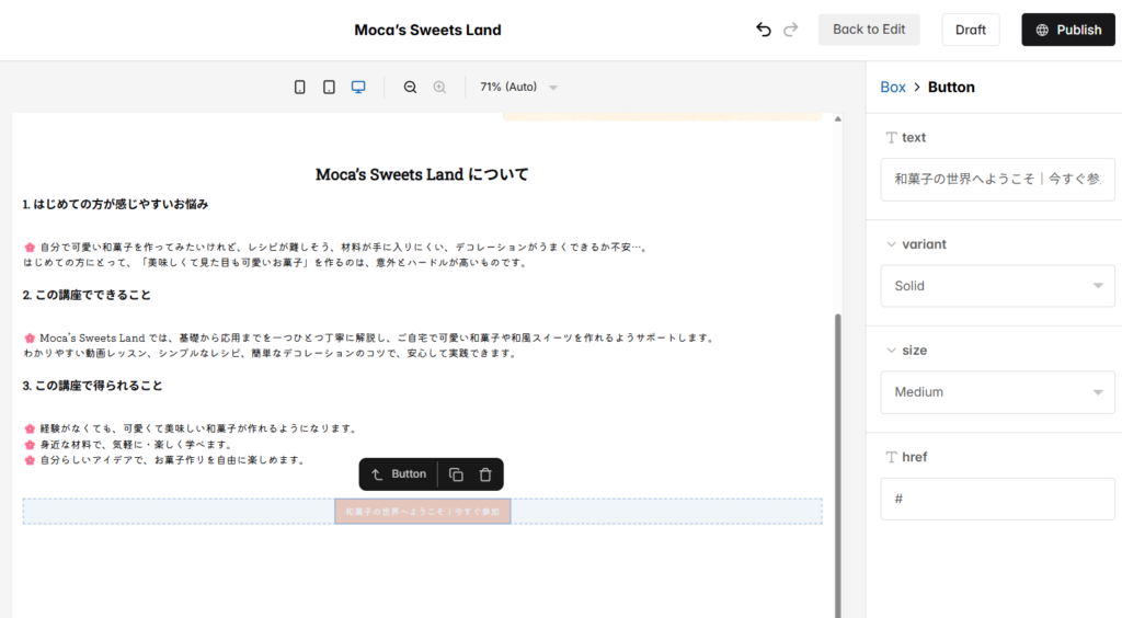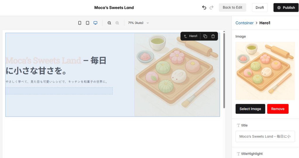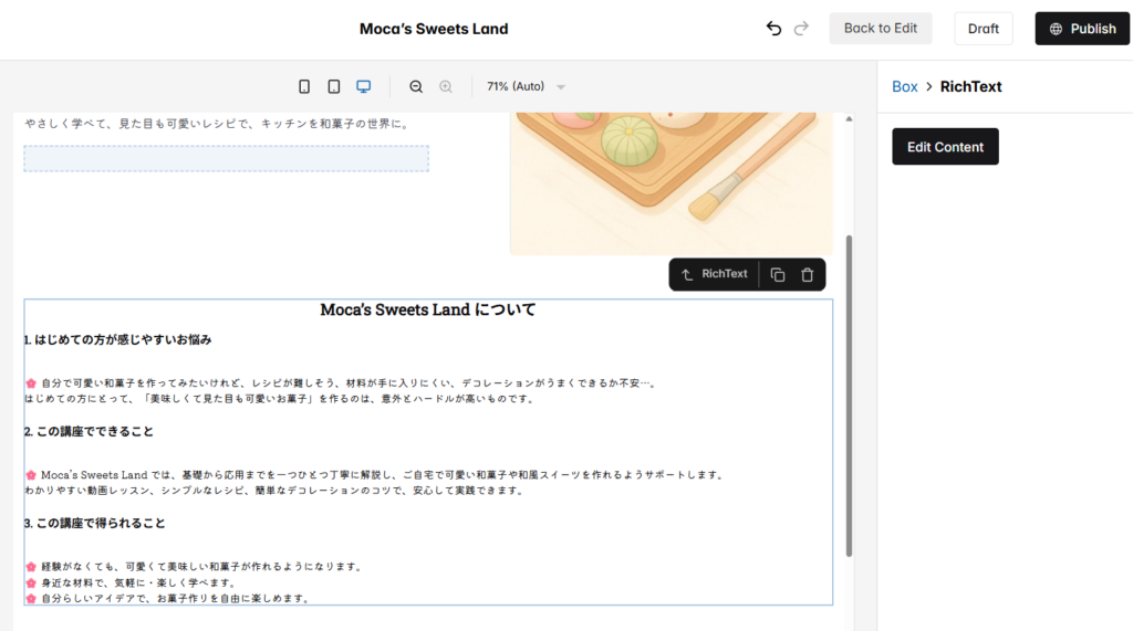 以下では、例として「Moca’s Sweets Land」をもとに、AIを活用して各セクションを作成する手順をご紹介します。