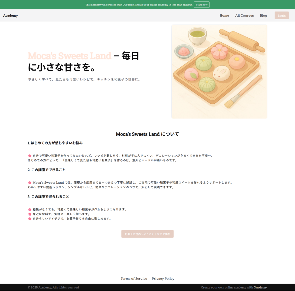 Ourdemyでは、AIで作成したコンテンツをそのまま反映し、ブランドや講座の雰囲気に合わせて微調整するだけで、プロフェッショナルで成果につながるランディングページを、最小限の労力で公開できます。